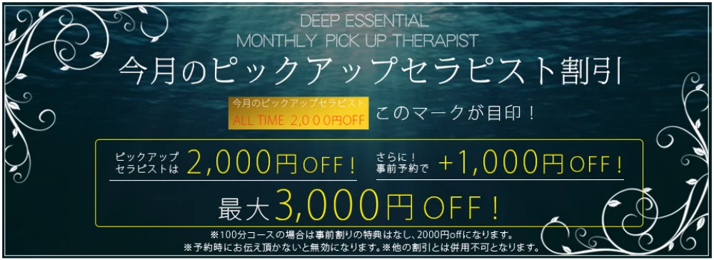 ピックアップセラピストは2,000円OFF!! ※更に事前予約をすると+1,000円OFFで、最大3,000円OFF! ※100分コースの場合は事前割りの特典はなし、2000円offになります。