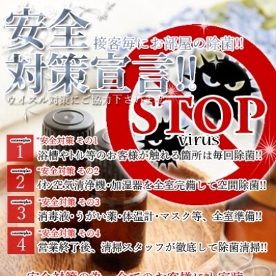 新型コロナウイルス、インフルエンザ等の感染予防の為、全てのお客様に入室時の手洗いうがい、消毒、検温をお願いしております。又、コロナウイルス感染拡大の為、状態が沈静化する迄の間はセラピストさんがマスクを着用する事をご了承下さいませ。