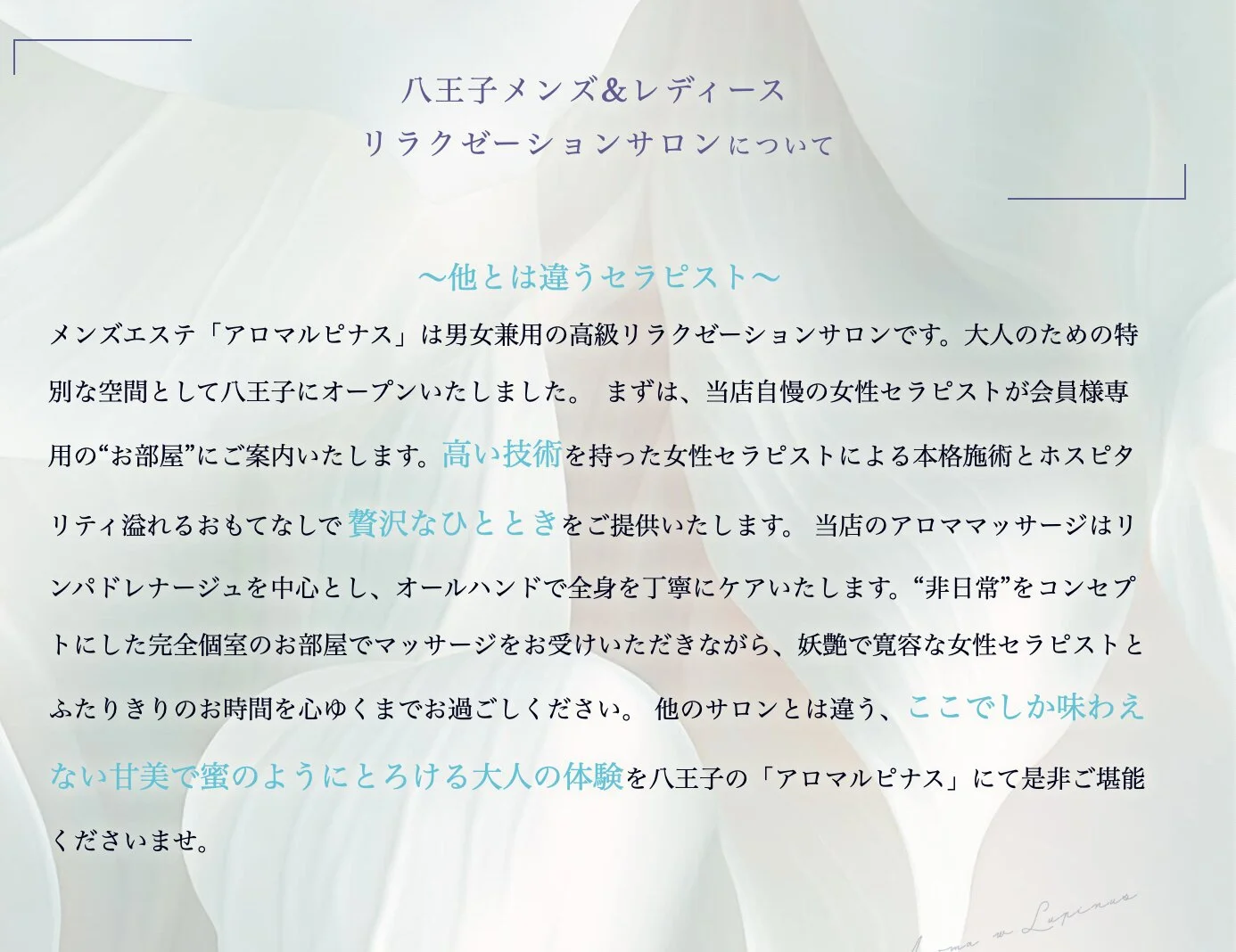 メンズエステ「アロマルピナス」は男性専用の高級リラクゼーションサロンです。大人のための特別な空間として八王子にオープンいたしました。 まずは、当店自慢の女性セラピストが会員様専用の“お部屋”にご案内いたします。高い技術を持った女性セラピストによる本格施術とホスピタリティ溢れるおもてなしで贅沢なひとときをご提供いたします。 当店のアロママッサージはリンパドレナージュを中心とし、オールハンドで全身を丁寧にケアいたします。“非日常”をコンセプトにした完全個室のお部屋でマッサージをお受けいただきながら、妖艶で寛容な女性セラピストとふたりきりのお時間を心ゆくまでお過ごしください。 他のメンズエステとは違う、ここでしか味わえない甘美で蜜のようにとろける大人の体験を八王子の「アロマルピナス」にて是非ご堪能くださいませ。