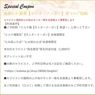 ■ご予約時「エステ魂【モニタークーポン】希望!」と仰ってください。