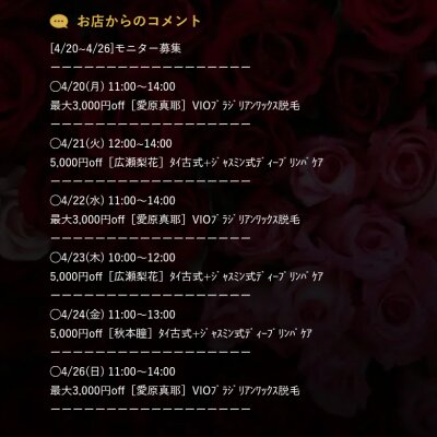 4/20[本日出勤セラピスト]ご予約お待ちしております♪