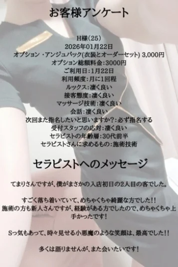 いろんなマッサージを研究しています!主に鼠径部やお客さまの反応を見て気持ちよさそうなところを選んでたくさん癒します♡
