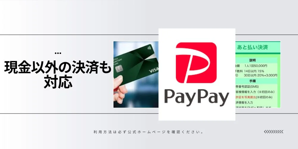 現金のほか、後払い決済・クレジットカード・PayPayでのお支払いが可能です。必ずご予約の際にお申し付けください。詳しくは公式HPをご覧ください。