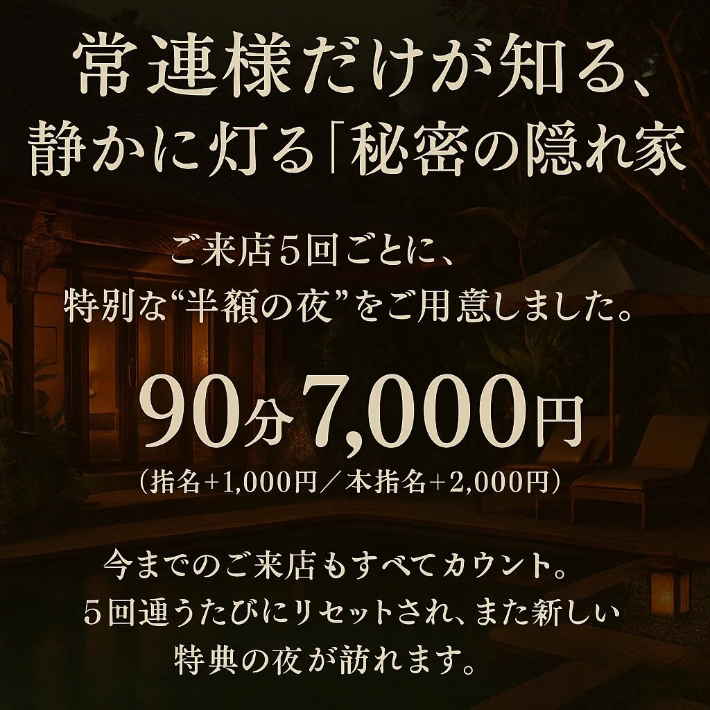 ご来店5回で次回90分 7,000円(別途:指名+1,000円/本指名+2,000円)例=90分7000円と通常イベント90分12000or14000で180分も可能。静かに灯る灯りの中、特別な夜を。