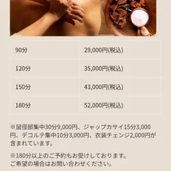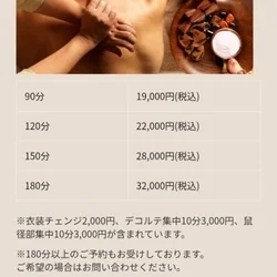 ※鼠径部集中30分9,000円、ジャップカサイ15分3,000円、デコルテ集中10分3,000円、衣装チェンジ2,000円が含まれています。 ※180分以上のご予約もお受けしております。 ご希望の場合はお問い合わせください。
