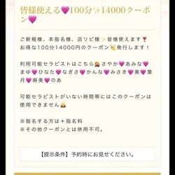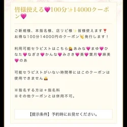 皆様使える🩷100分✨14000クーポン🩷このクーポンで予約するご新規様、本指名様、店リピ様✨皆様使えます❣️