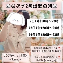 初めてのメンエスでフリーでお願いしました。 ドキドキしながらの対面で、目の前に天使のなぎさちゃんがいました。笑顔が素敵でおしゃべり上手ななぎさちゃん、可愛すぎ♥️ 説明もしっかりしてくれて安心感マックス。 施術も優しくマッサージしてくれて本当虜になっちゃいました。時間たつのが早くて、いい年のおじさんがずっとドキドキしっぱなしでした。リピ絶対な女の子です。ありがとうございました。必ず会いに行きます。次回は指名で120分。宜しくね😃
