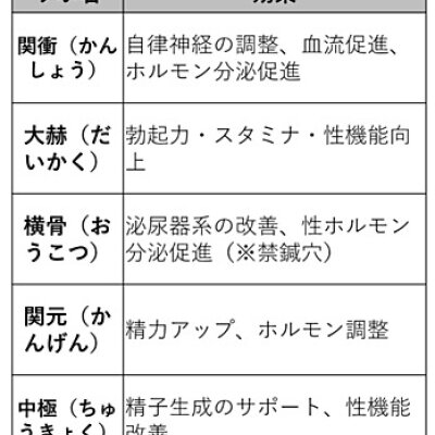 当院では、まず「テストステロン不足の可能性」を考慮し、下腹部のツボ「関元」「大赫」「横骨」にお灸を行い、血流改善とホルモンバランスの調整を図った。