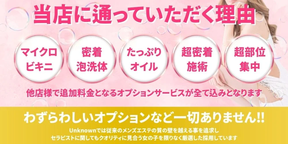 『未知なる洗体』×『未知なる超密着』 Unknownでは従来のメンズエステの質の壁を越える事を追求し、セラピストに関してもクオリティに見合う女の子を限りなく厳選した採用しています。