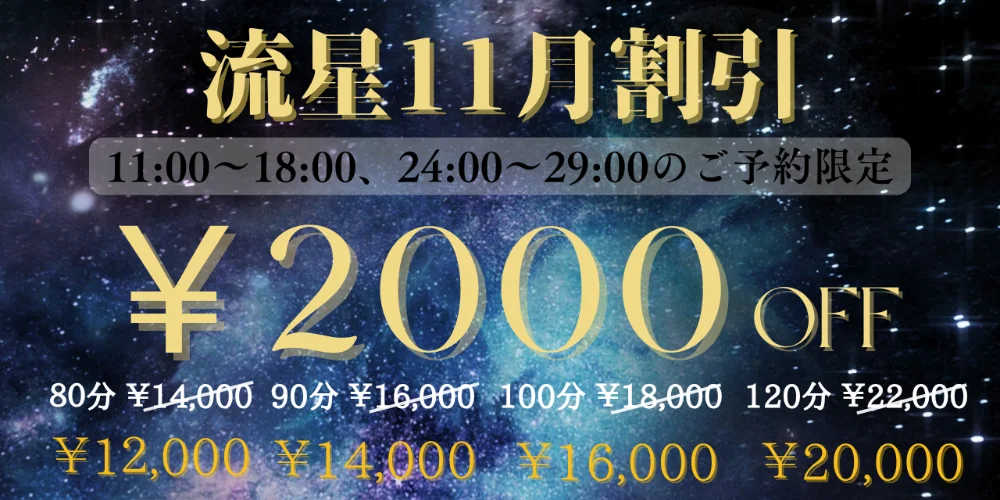 当店は流れ星のような非日常体験をテーマにしたメンズエステです。 星が降り注ぐ空間で過ごす完全プライベートな時間。 美しく重力のように惹きつけるセラピストと過ごす時間はまさに一瞬で心を奪われる奇跡。