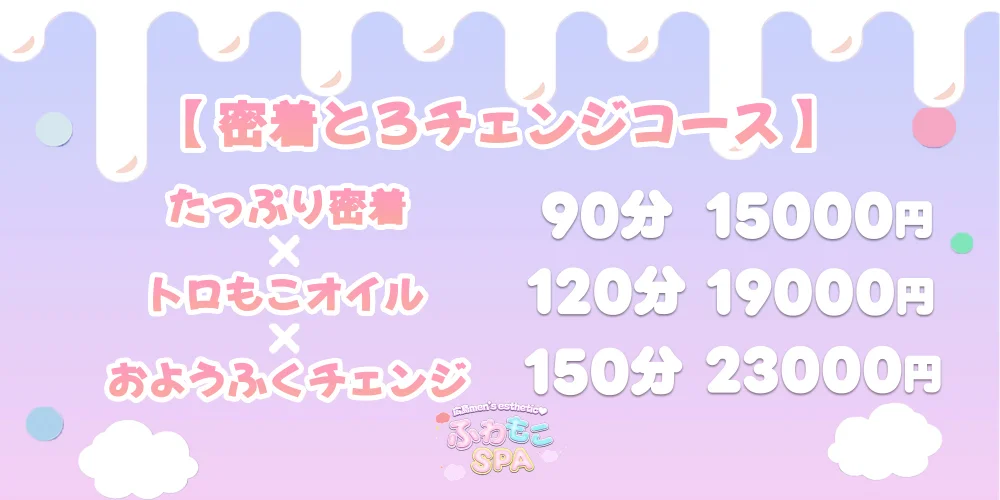 💗密着たっぷり×とろもこオイル×おようふくチェンジ 90分 15000円 120分 19000円 150分 23000円 ※指名の場合別途指名料1.000円かかります。