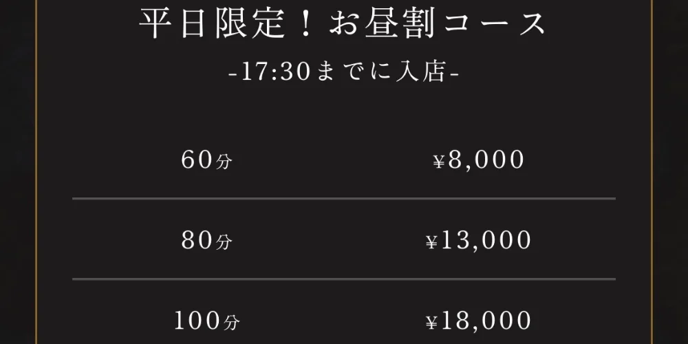通常コースに加え、極液をさらに増量した「倍々コース」をご用意。平日限定のお得な割引もあり、ご予算や気分に合わせて、特別なひとときをお選びいただけます。