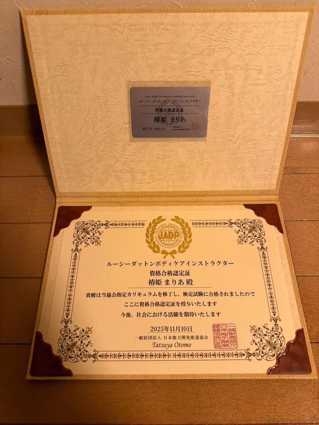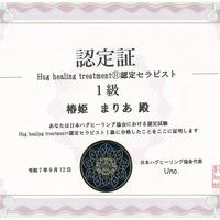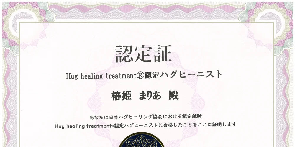 世界で、10番目のハグヒーリング協会、ハグヒーニスト。 難関な試験に1発合格した最高峰セラピストです。 ハグヒーニストは北海道&東北エリアで、椿姫まりあただ一人だけです。