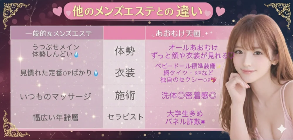 『あおむけ天国』は、オール仰向け施術です♡ ずっと仰向け密着‥♡とろける快感♡ ぜひ体験してみて下さい♡ きっと、他のメンズエステじゃ満足できない体になります‥