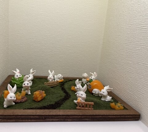 画像はそのトイレの棚でお迎えしているうさぎたちです。