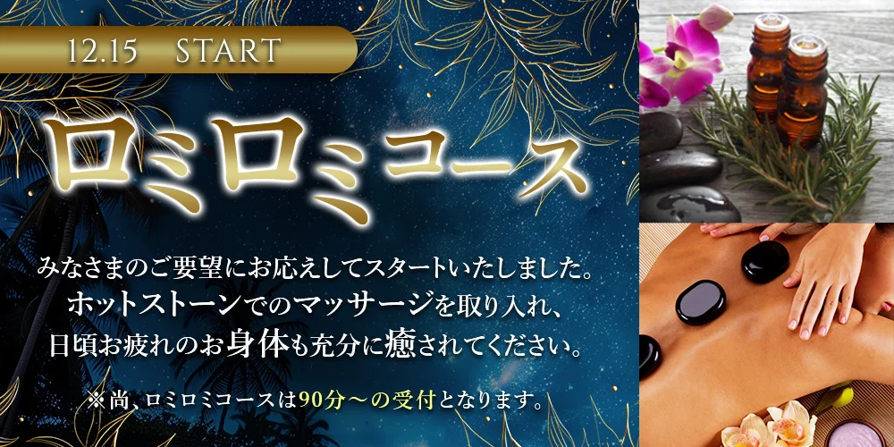 ロミロミコースが気になってフリーで予約しましたがすごく気持ち良くいつの間にかヘビーユーザーになってしまいました。 最近はジャスミンさんのロミロミがすっかりお気にです。 また利用しまーす!