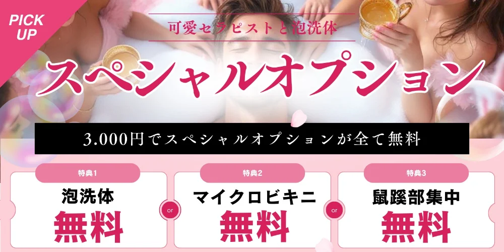 【スペシャルオプション内容】 ・鼠蹊部集中 ・泡洗体 ・マイクロビキニ ・その他衣装 ・オイル増量 etc... 3000円で全て付いてくる!! スペシャルオプションの内容は直接お店にご確認お願いいたします。